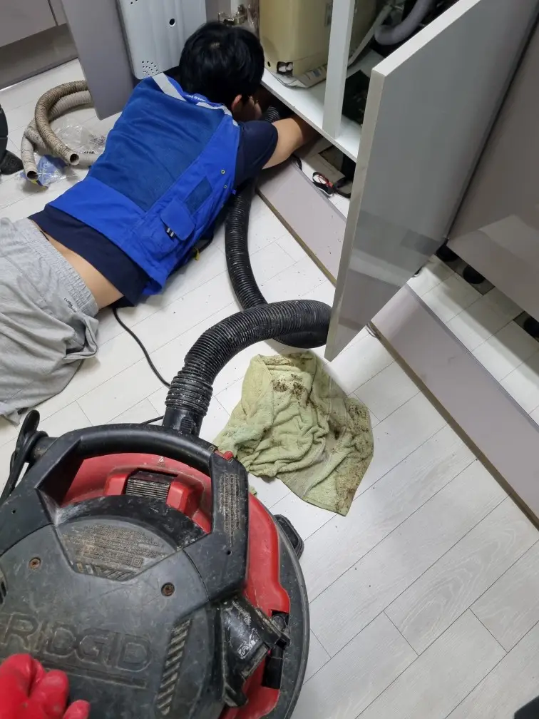 고압세척 과정에서 배수관 내부가 완전히 깨끗해졌는지 확인했습니다. 물이 원활하게 흐르고 배수관 내부에 이물질이 남아있지 않은 상태가 되었습니다. 이제 싱크대에서 물을 틀어도 막힘 없이 빠르게 배수되는 것을 확인할 수 있었습니다.
